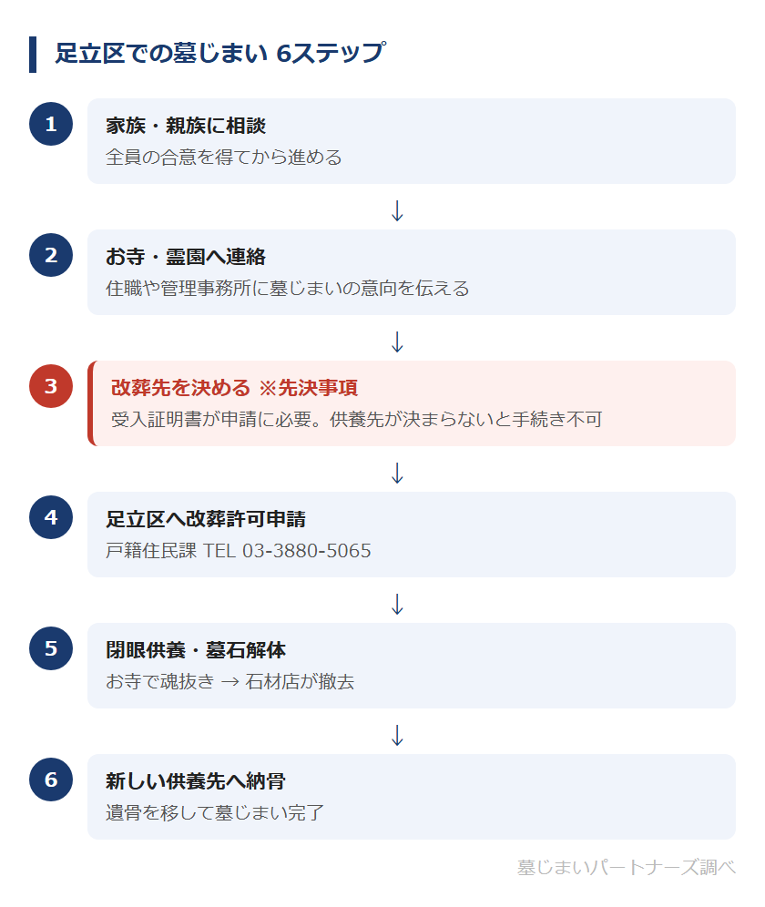 改葬先を先に決めておくことが重要です。足立区への改葬許可申請には、新しい供養先が発行する「受入証明書または使用許可書」が必要になります。供養先が決まっていない状態では申請を進めることができませんので、この順番を守ることが手続きをスムーズに進めるポイントです。