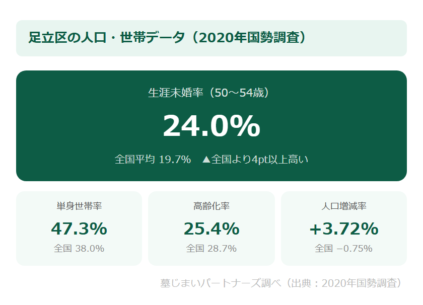 2020年の国勢調査によると、足立区では50〜54歳時点の生涯未婚率が24.0%(全国平均19.7%)と全国を4ポイント以上上回っています。「将来お墓を引き継ぐ人がいない」「子どもに管理を任せられない」という状況は、足立区でも多くの方が直面している現実です。