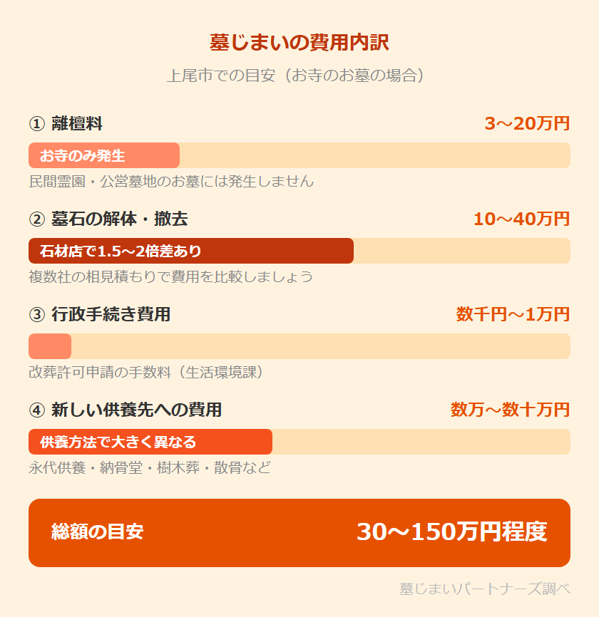墓じまいにかかる費用は、大きく「①離檀料」「②石材店への解体・撤去費用」「③改葬先への費用」の3つに分かれます。それぞれの目安を確認しておきましょう。