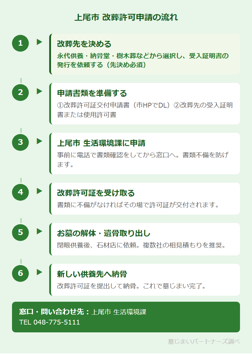 - 改葬許可申請の窓口は上尾市 生活環境課(TEL:048-775-5111)。まずは電話で書類の準備について確認してから窓口へ向かいましょう。