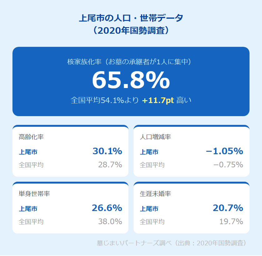 上尾市の人口は2015年から2020年にかけて-1.05%減少しており(全国平均-0.75%)、全国より速いペースで人口が縮小しています。生涯未婚率も20.7%(全国平均19.7%)とやや高めで、子がいない世帯も一定数存在します。将来的にお墓の管理を続けられなくなるリスクは、地域全体として無視できない問題です。