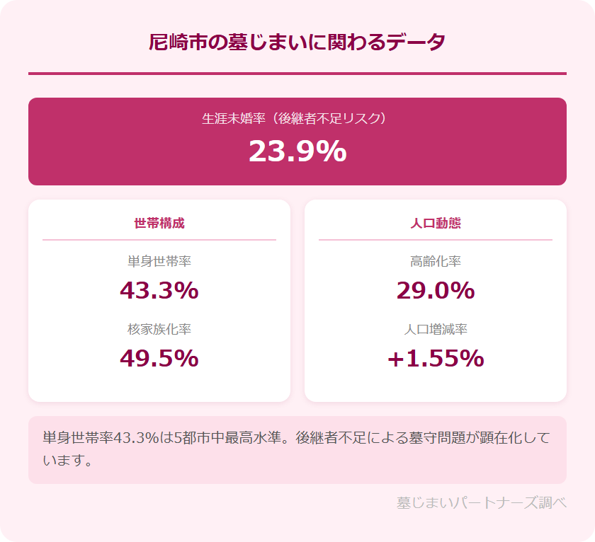 兵庫県尼崎市でお墓の管理に困っているご家族が増えています。尼崎市は高齢化率29.0%(全国平均28.7%)、単身世帯率43.3%(全国平均38.0%)と、大都市圏の中でも特に単身世帯が多い都市です。さらに生涯未婚率23.9%(全国平均19.7%)と突出した数値が示すように、後継者のいないお墓が今後さらに増加することが予想されます。