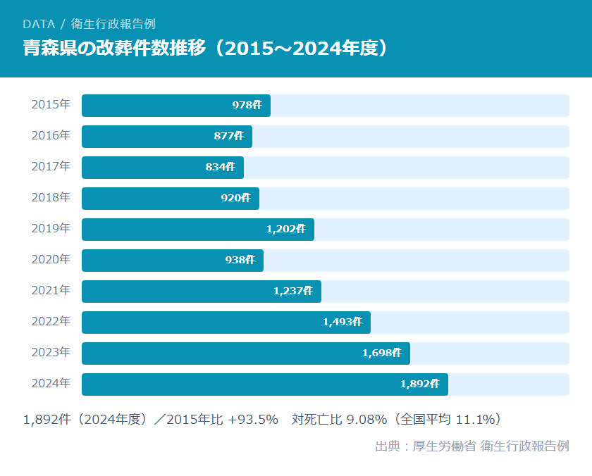 青森県内の改葬件数(厚生労働省衛生行政報告例)は、2015年度の978件から2024年度には1,892件へと、この10年間で93.5%増加しました。特に2019年以降は増加ペースが加速しており、2022年・2023年・2024年と3年連続で過去最高を更新しています。