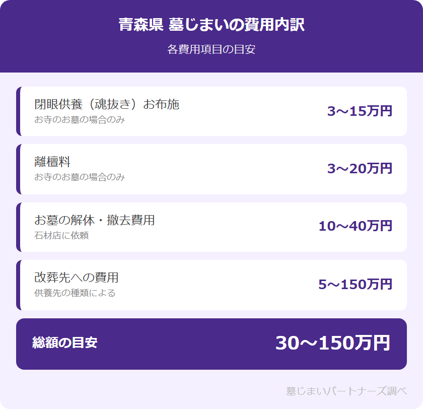 青森から関東・関西の施設へ改葬する場合は、現地での契約手続きや移動費も加味して検討してください。費用を抑えたい場合は合祀型の永代供養墓や樹木葬が選ばれることが多く、改葬先への費用を5〜150万円の範囲でお考えください。