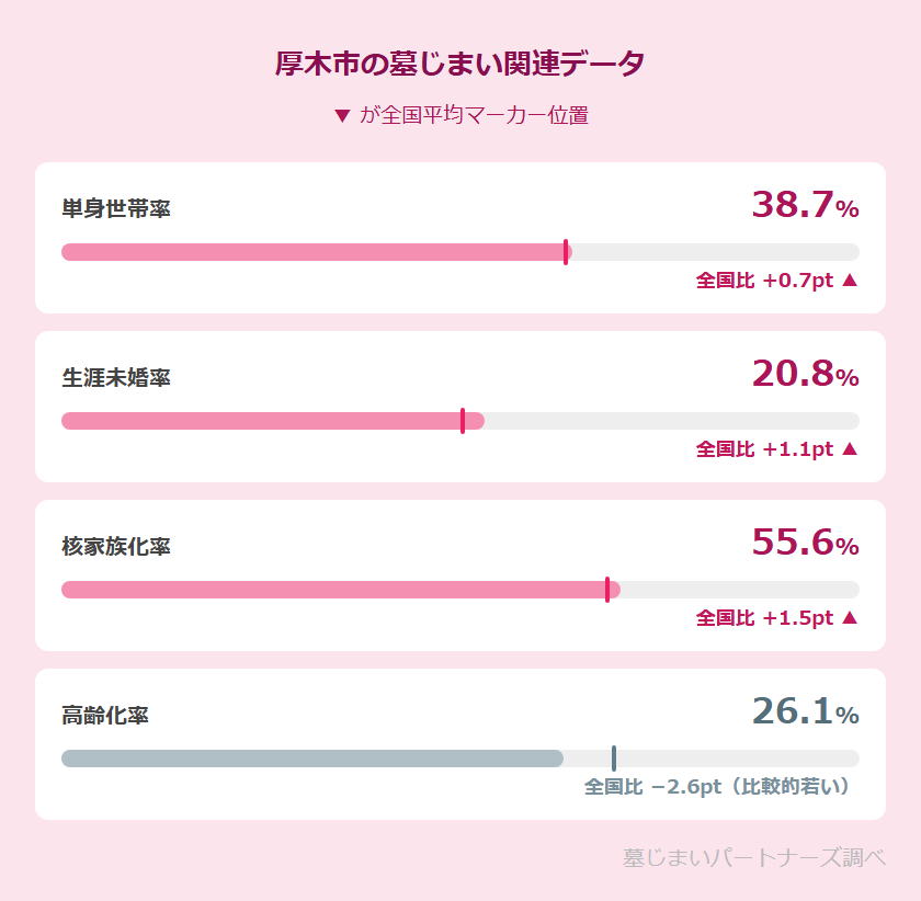 厚木市では生涯未婚率20.8%・単身世帯率38.7%・核家族化率55.6%と、お墓の後継者不在につながる指標がいずれも全国平均を上回っています。特に単身・未婚世帯の方には、早めの対応が重要です。