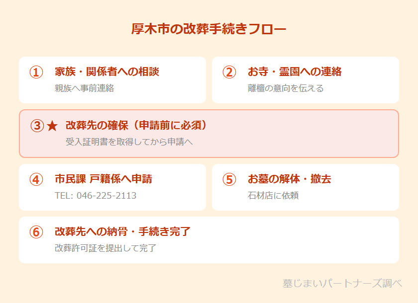 改葬先(永代供養墓・納骨堂など)の受入証明書を先に取得してから厚木市 市民課 戸籍係への改葬許可申請に進む手順が必要です。「まず申請してから供養先を探す」という順番では手続きが進まないため注意しましょう。