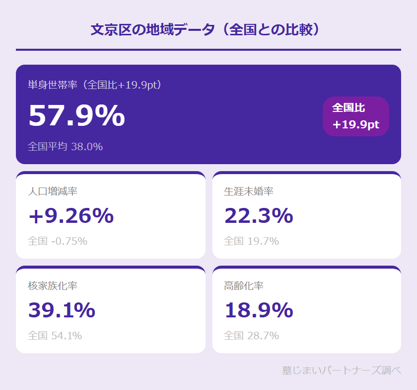 2020年の国勢調査によると、文京区の単身世帯率は57.9%(全国平均38.0%)と高く、人口増減率は+9.26%と全国平均(-0.75%)を大幅に上回っています。東京大学・お茶の水女子大学など有名大学や大学病院が集まる学術・文化の街として、全国各地から学生・研究者・医療従事者が転入し続けています。転入した単身世帯の多くが「実家や故郷にあるお墓をどうするか」という問題に直面しています。