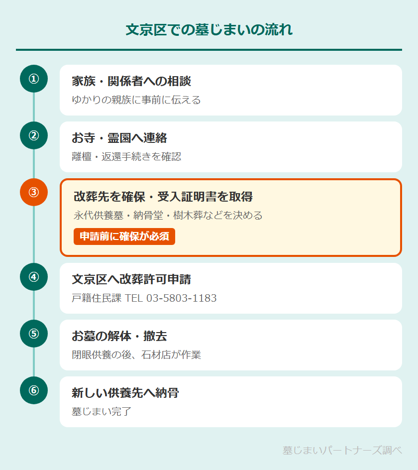 - 改葬許可申請は「お墓がある自治体」で行うのが原則。文京区内のお墓なら戸籍住民課(TEL: 03-5803-1183)、地方のお墓ならそちらの市区町村窓口へ。