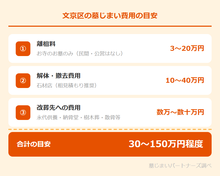 墓じまいにかかる費用は、大きく「①離檀料」「②石材店への解体・撤去費用」「③改葬先への費用」の3つに分かれます。それぞれの目安と、東京都内ならではの注意点を確認しておきましょう。