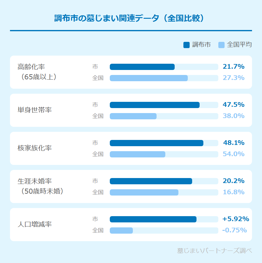 調布市は人口増加が続く転入型の都市で、単身世帯率47.5%・核家族化率48.1%という数字が示すように、お墓の継承者問題が顕在化しやすい環境にあります。