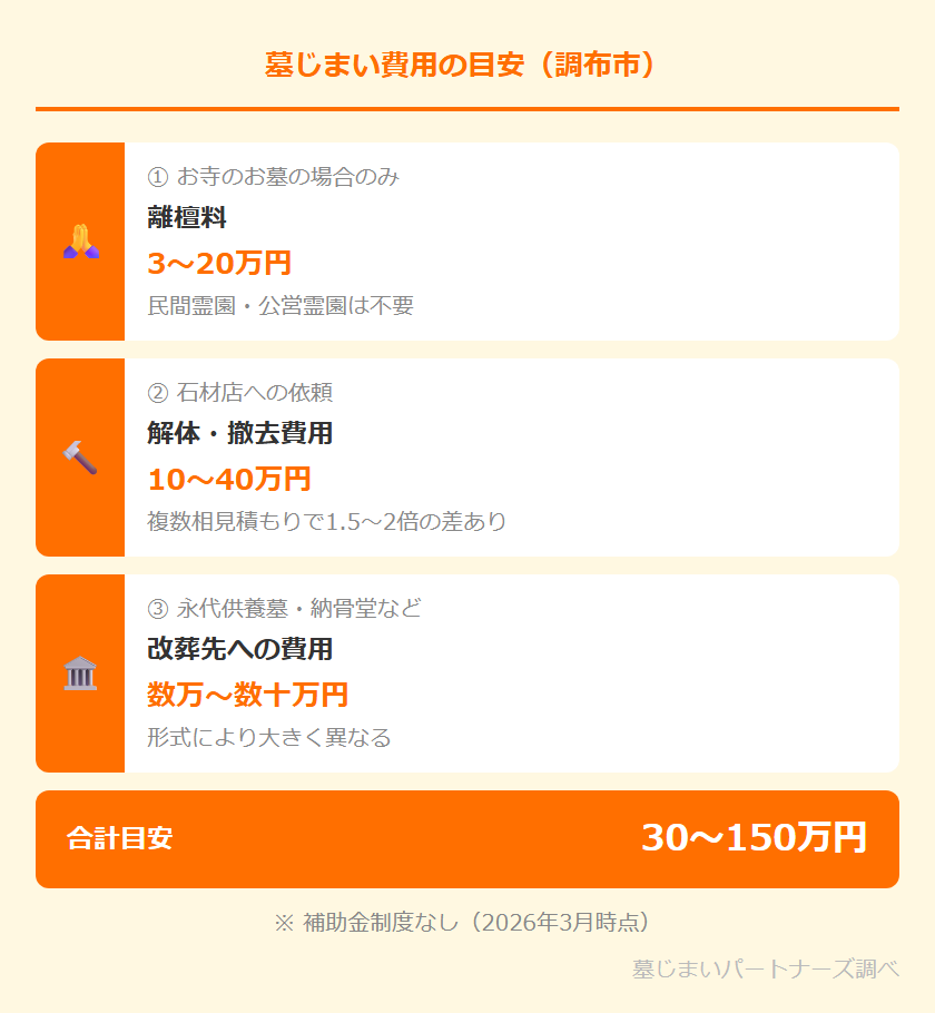 2026年3月時点で、調布市には墓じまい(改葬)に関する補助金制度はありません。費用は自己負担となります。費用を抑えるには石材店の相見積もりや、費用を抑えやすい供養先の選択が有効です。