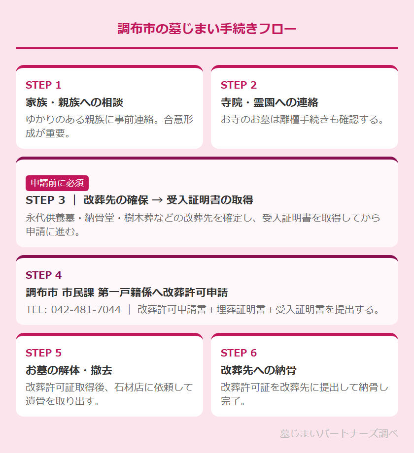 調布市の市民課 第一戸籍係(TEL: 042-481-7044)で受け付けています。申請前に改葬先の確保と受入証明書の取得が必要です。詳細は調布市公式サイトでご確認ください。