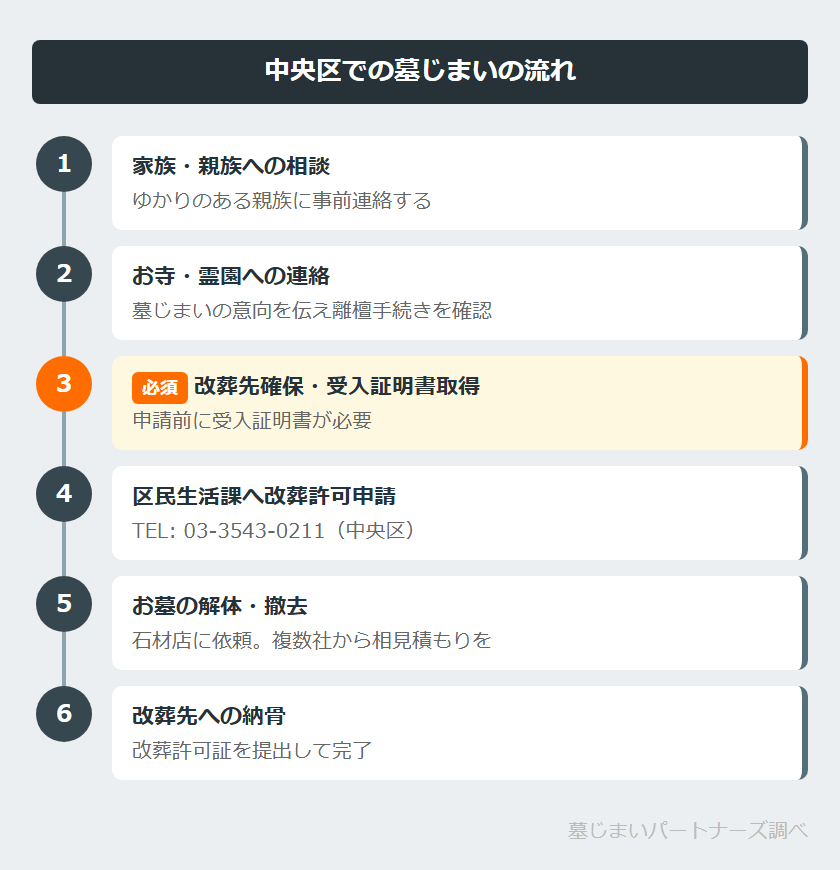 改葬先が決まったら、中央区の窓口に改葬許可申請を行います。申請窓口は区民生活課(TEL: 03-3543-0211)です。詳しくは次の章で解説します。