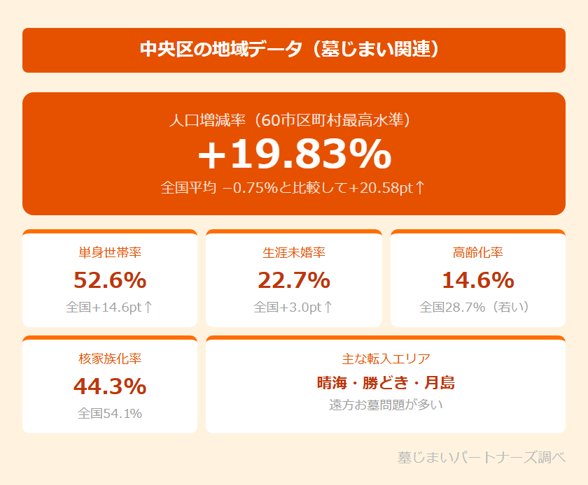 中央区の人口増減率は+19.83%(全国平均は0.75%の減少)で、調査対象60市区町村の中でも突出した数値です。晴海フラッグ(旧東京オリンピック選手村跡地)をはじめ、勝どき・月島・豊海など臨海部の大規模マンション開発により、近年急速に転入者が増えています。銀座・日本橋の商業エリアで働く単身者・共働き夫婦も多く、全国各地から集まった世帯が多数を占めます。こうした転入世帯の多くは、出身地(地方の実家)にお墓を持っており、「今は管理できていないが、いずれどうにかしなければ」という問題を抱えています。