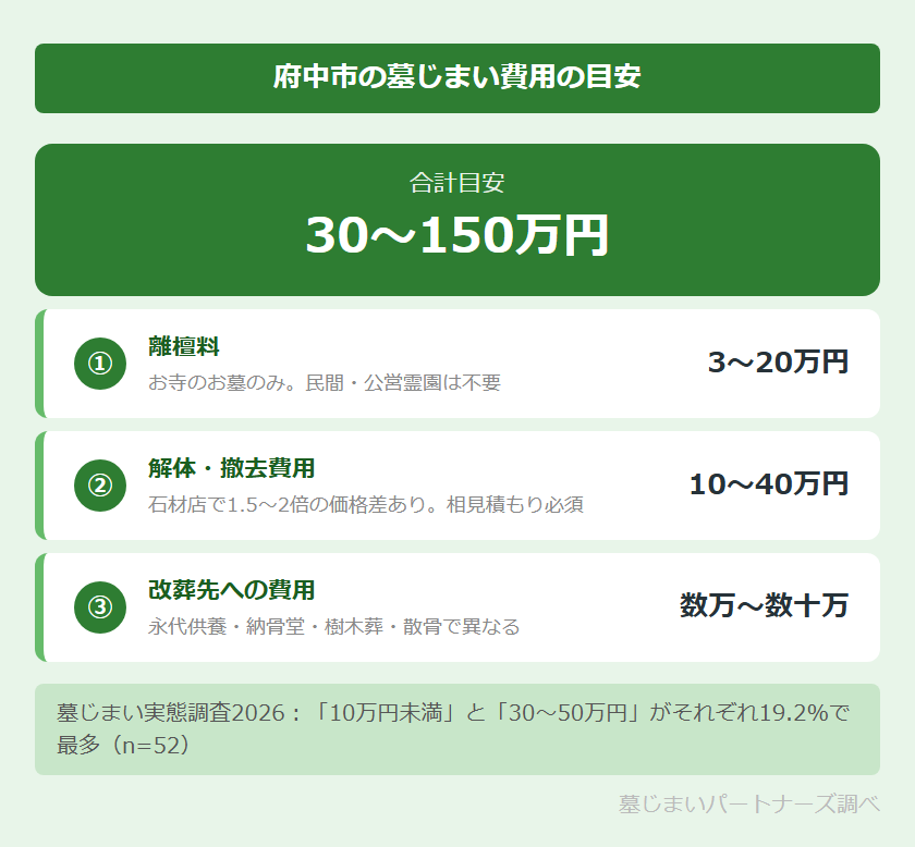 2026年3月時点で、府中市には墓じまい(改葬)に関する補助金制度はありません。費用は自己負担となります。費用を抑えるには石材店の相見積もりや、費用を抑えやすい供養先の選択が有効です。