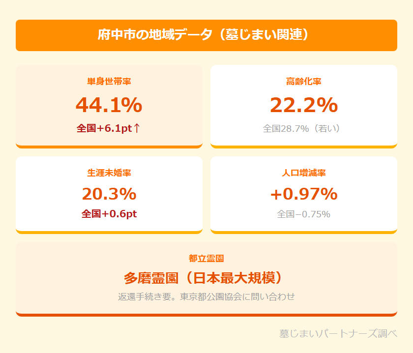 府中市は東京都多摩地区の中央に位置し、大国魂神社の門前町として長い歴史を持つ都市です。単身世帯率44.1%(全国比+6.1pt)と単身者の多い一方、高齢化率22.2%と全国平均(28.7%)を大きく下回る若い世代が多いエリアです。しかし「今は若いから大丈夫」という意識のうちに、将来的なお墓の継承者問題が先送りされがちなのも府中市の特徴です。
