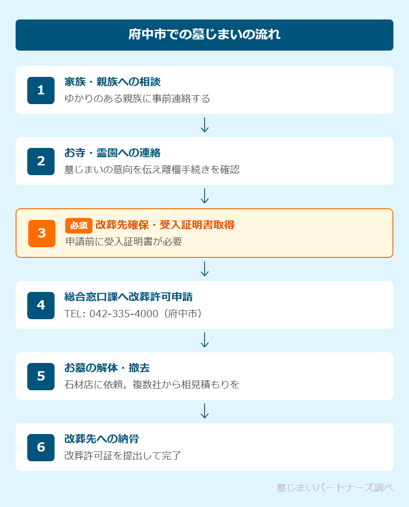 府中市の総合窓口課(TEL: 042-335-4000)で受け付けています。申請前に改葬先の確保と受入証明書の取得が必要です。詳細は府中市公式サイトでご確認ください。