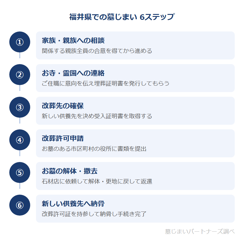 墓じまいは、家族・お寺・役所・石材店・改葬先の複数の関係者との調整が必要な手続きです。福井県での一般的な流れを6つのステップで確認しましょう。詳しい手続き全体については墓じまいの流れを8ステップで解説もご参照ください。