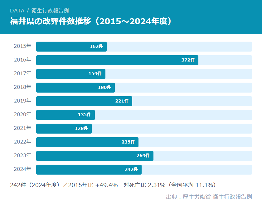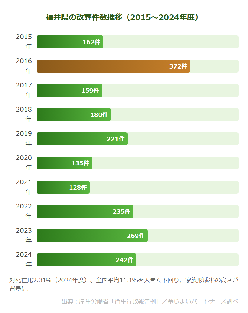 福井県の改葬件数は、2015年度の162件から2024年度の242件へと増加しています。対死亡比(死亡者数に対する改葬件数の割合)は2024年度2.31%で、全国平均11.1%を大きく下回っており、福井県は全国的にみても墓じまいが少ない県のひとつです。ただし長期的には増加傾向にあり、2016年度には372件と突出して多い年もありました。