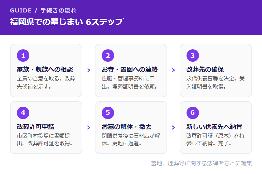 - 手続きは①家族相談→②お寺連絡→③改葬先確保→④改葬許可申請→⑤解体撤去→⑥納骨の6ステップで進みます。福岡市・北九州市は各区が窓口となります。
