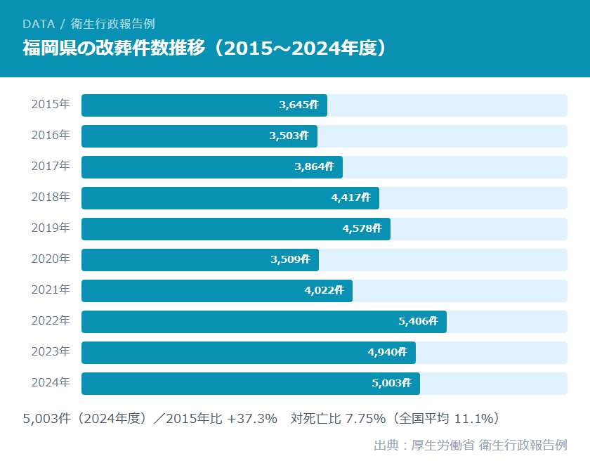 また、改葬件数の年次推移を見ると、2015〜2019年は3,645〜4,578件と増加基調で推移し、2020年はコロナ禍の影響で3,509件と一時的に減少したものの、2021年以降は急回復し2022年に5,406件のピークを記録しました。2023〜2024年は4,940〜5,003件と5,000件前後の高水準で推移しており、今後も同水準が続くと予測されます。