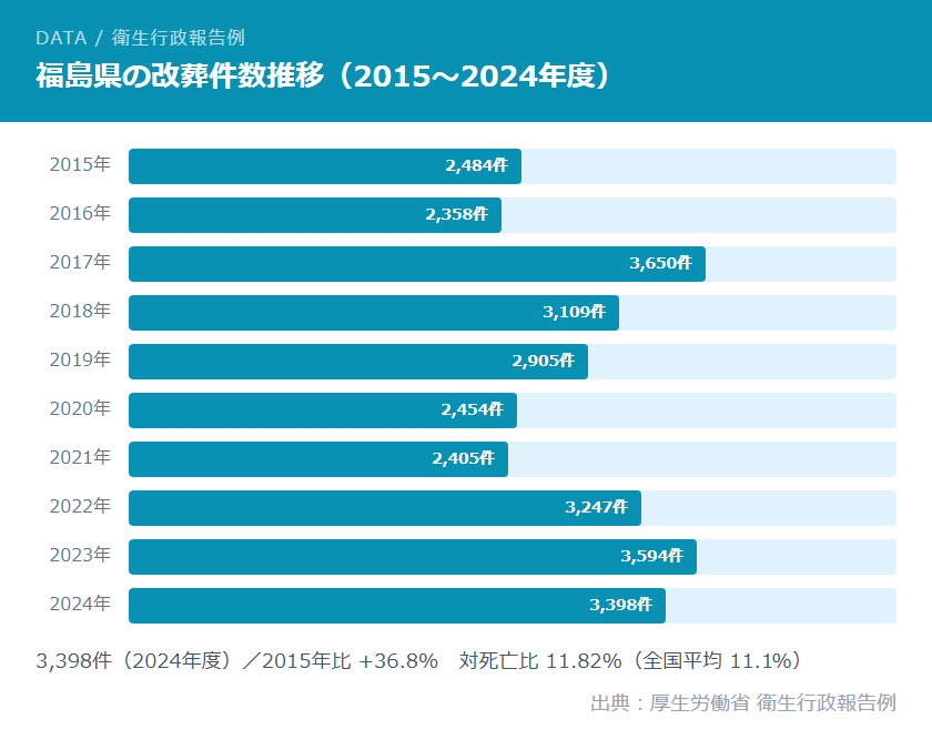 福島県での墓じまいは、少子高齢化・人口減少という全国共通の課題に加え、東日本大震災・福島第一原発事故という県固有の事情が重なり、年々増加しています。2024年度の改葬件数は3,398件で対死亡比11.82%と全国平均を上回っており、墓じまいは今や珍しいことではなくなっています。