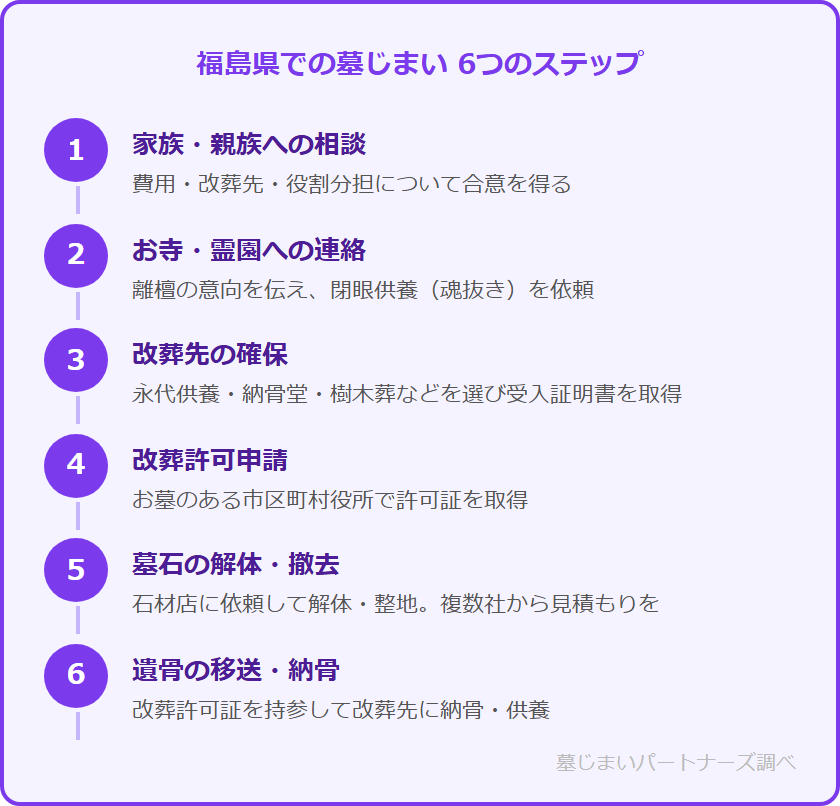墓じまいは「お墓を撤去するだけ」ではなく、複数のステップを順番に進める必要があります。ここでは福島県での墓じまいの一般的な流れを6つのステップに分けて解説します。