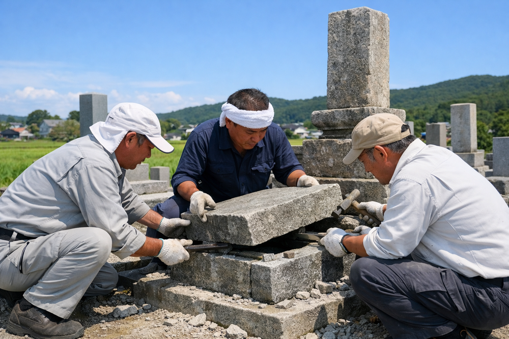 墓石の解体から搬出・処分、区画の整地までを石材店が担当します。費用の目安は10〜40万円程度です。