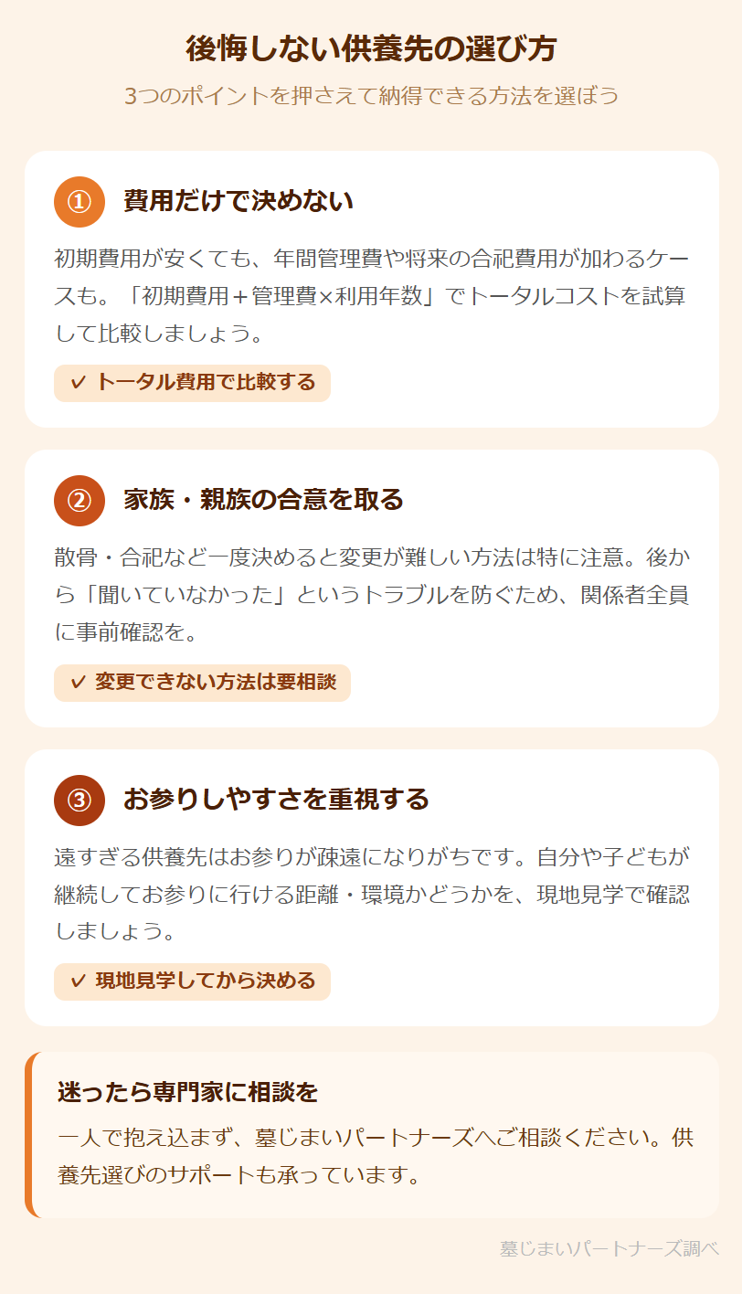 費用はあくまで目安であり、施設や地域によって大きく異なります。「安いから」「人気だから」という理由だけで決めるのではなく、家族の状況や気持ちに合った方法を選ぶことが重要です。以降のセクションでは、各供養方法の特徴・選び方のポイントをより詳しく解説します。