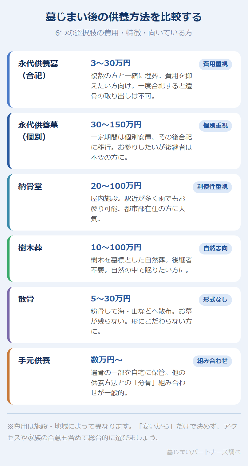 墓じまいのその後に選べる供養方法は、大きく分けて6つあります。それぞれに費用・特徴・向いている方が異なりますので、まずは全体像を把握しておきましょう。
