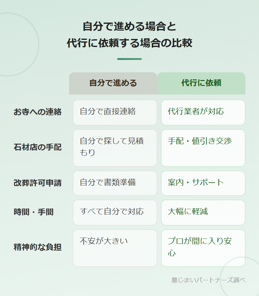 墓じまいは代行業者に依頼せず、自分で進めることもできます。ここでは、自分で進める場合と代行に依頼する場合を比較してみましょう。
