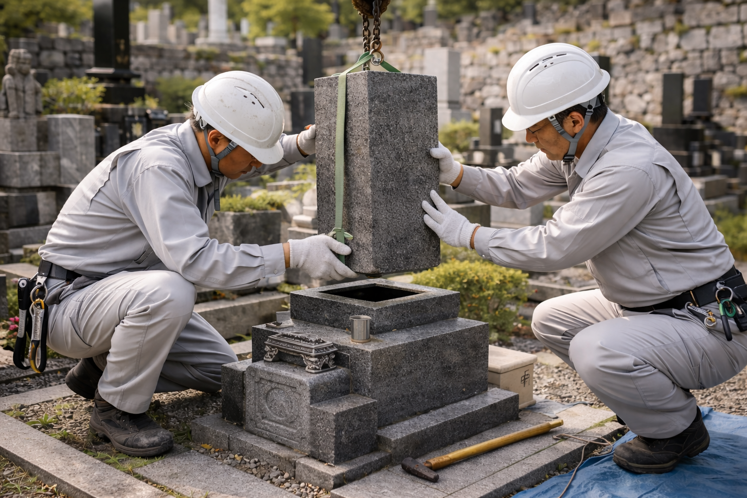 遺骨の取り出し・墓石撤去:石材店に依頼して、お墓から遺骨を取り出してもらい、墓石を解体・撤去します。区画は更地に戻して墓地管理者に返還します。費用は10〜40万円程度です。