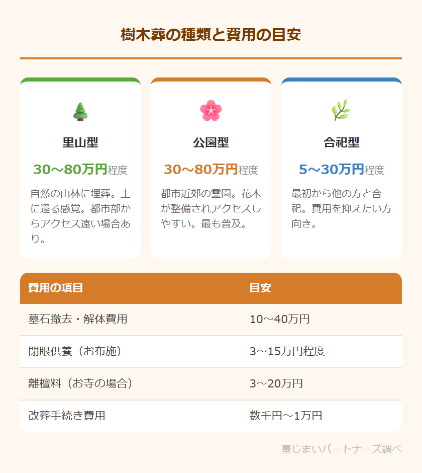 樹木葬の費用は、霊園の種類・立地・個別安置の有無によって大きく異なります。また、墓じまいとセットでかかる費用も合算して把握しておく必要があります。