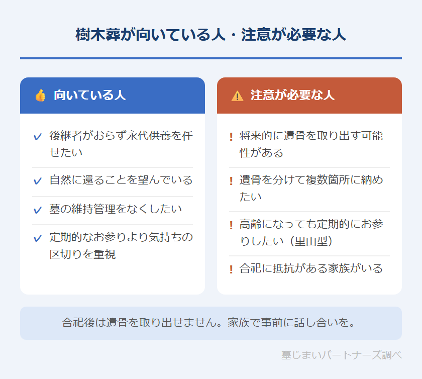 樹木葬はすべての方に最適な選択肢というわけではありません。ご自身やご家族の状況と照らし合わせて検討してみてください。
