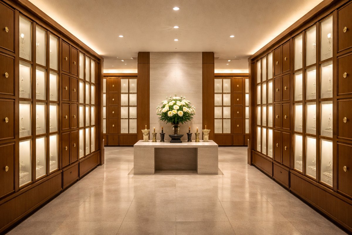一般的なお墓(墓地に建てる石墓)との大きな違いは、屋内施設であることと管理を施設側に委託できることです。草むしりや掃除といった日常的な墓地管理が不要で、悪天候でも参拝できます。