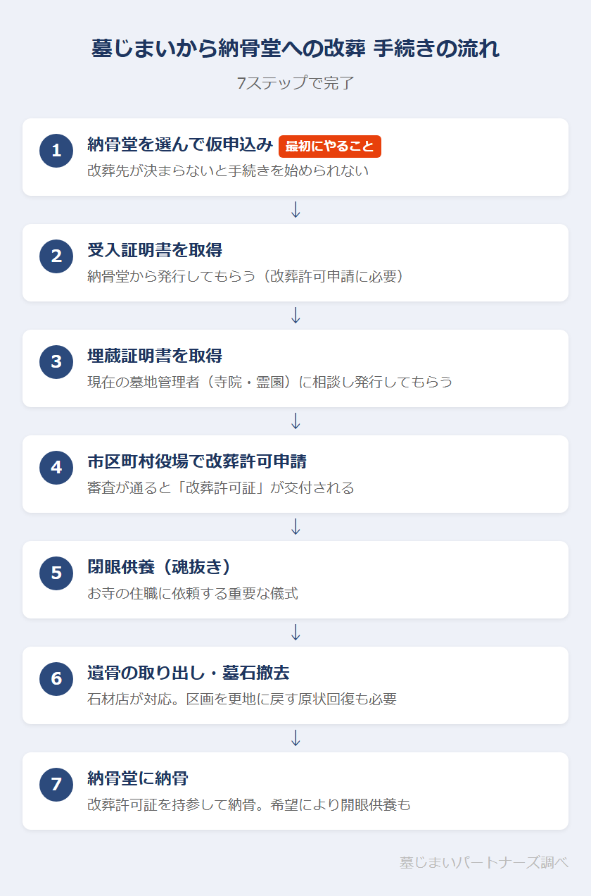 - 改葬手続きでは「まず納骨堂を選んで受入証明書を取得する」ことが第一歩