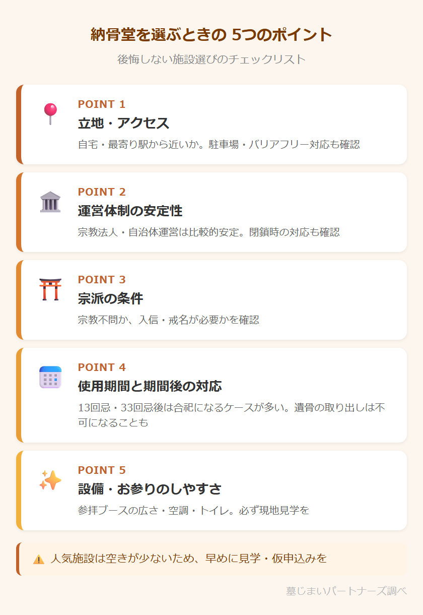 納骨堂は施設によって費用・立地・サービスが大きく異なります。後悔のない選択をするために、以下のポイントを確認しましょう。
