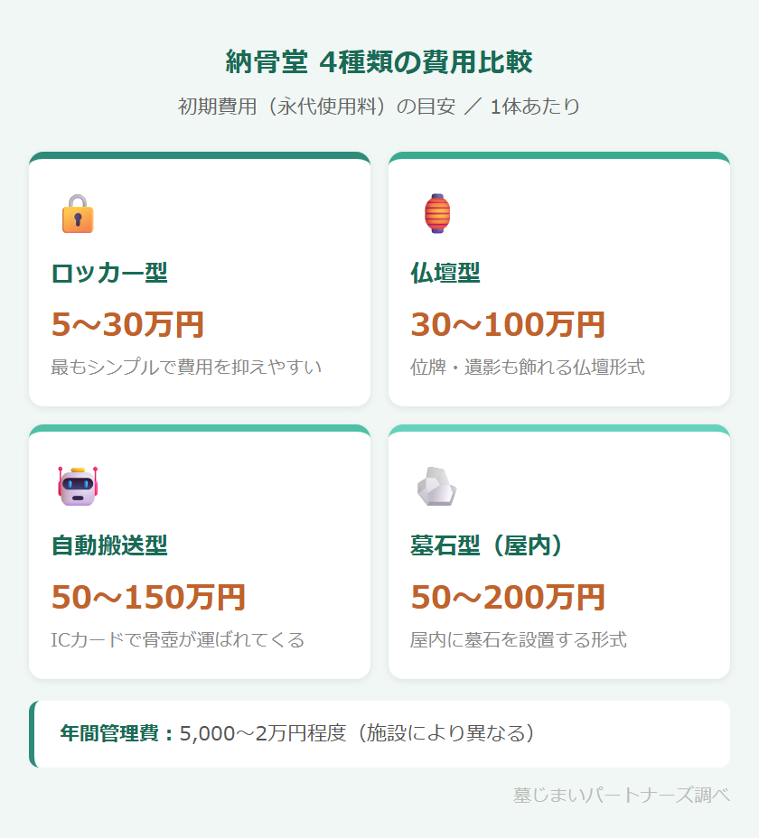 - 納骨堂にはロッカー型・仏壇型・自動搬送型など種類があり、費用やお参りスタイルが異なる