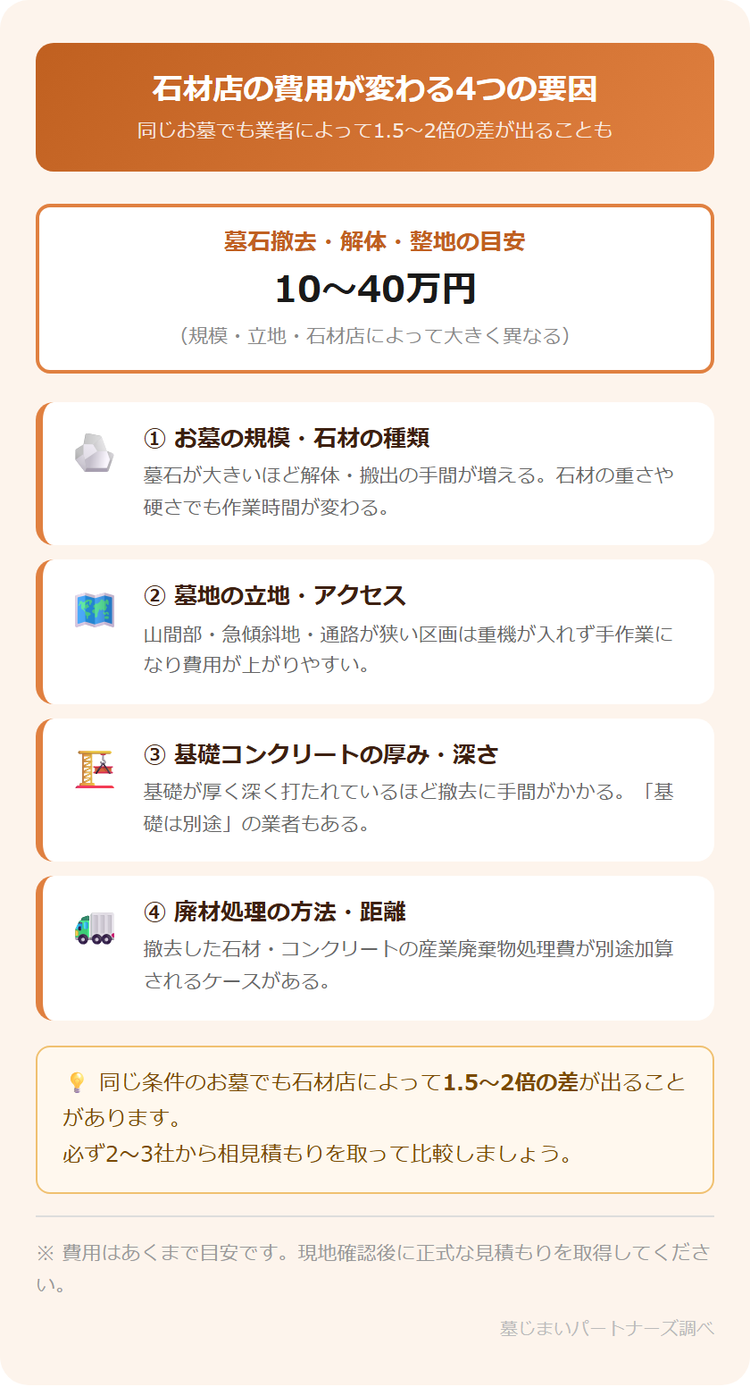 費用の幅が大きいのは、お墓の状態や立地によって作業量が大きく異なるためです。同じような見た目のお墓でも、石材店によって1.5〜2倍の差が出ることも珍しくありません。