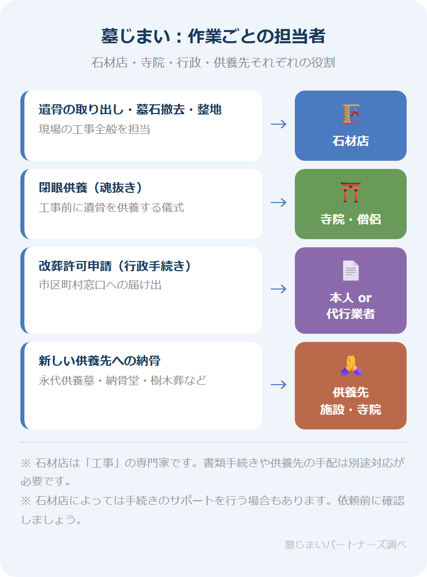- 石材店の役割:遺骨の取り出し・墓石の撤去解体・墓地の整地が主な担当。書類手続きや供養先の決定は別の担い手が行う