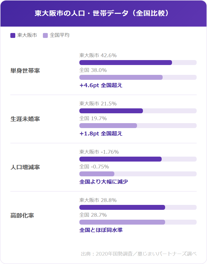 2020年の国勢調査によると、東大阪市では全世帯の42.6%が単身世帯です(全国平均38.0%)。また、人口は2015年から2020年にかけて-1.76%と全国平均(-0.75%)の2倍以上のペースで減少しており、「お墓を引き継ぐ家族がいない」「後継者に負担をかけたくない」という理由から、生前に墓じまいを選ぶ方が増えています。