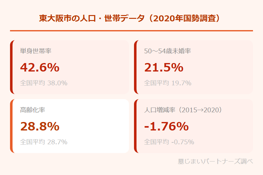 2020年の国勢調査によると、東大阪市の単身世帯率は42.6%(全国平均38.0%)です。全国平均を約4.6ポイント上回っており、一人暮らしの方が多い都市であることがわかります。また、50〜54歳時点の未婚率は21.5%で、全国平均19.7%を1.8ポイント上回っています。5人に1人以上が未婚のまま50代を迎えている計算になります。