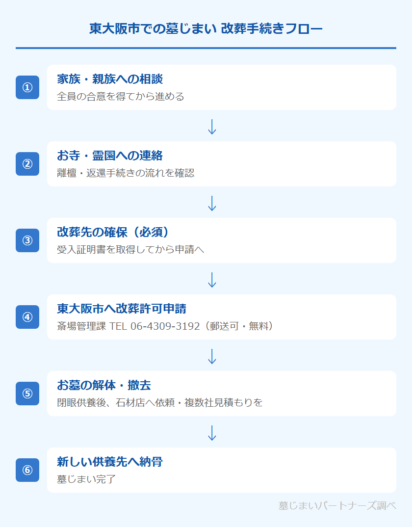 改葬先を先に決めておくことが重要です。東大阪市への改葬許可申請には、新しい供養先が発行する「受入証明書または使用許可書」が必要になります。供養先が決まっていない状態では申請を進めることができませんので、この順番を守ることが手続きをスムーズに進めるポイントです。