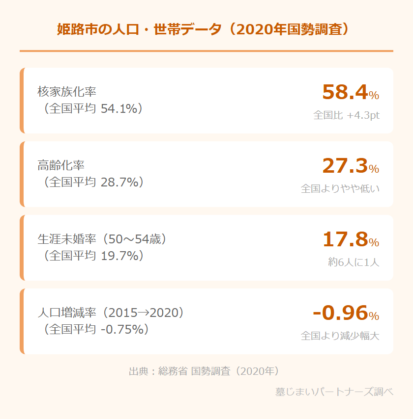 姫路市の人口は2015年から2020年にかけて0.96%減少しました(全国平均は0.75%の減少)。全国平均よりも減少幅がやや大きく、特に若年層の都市部への流出が見られます。姫路市で生まれ育った方が進学や就職で神戸・大阪・東京などに移り、地元に残る親世代が一人でお墓を守っているというケースは珍しくありません。