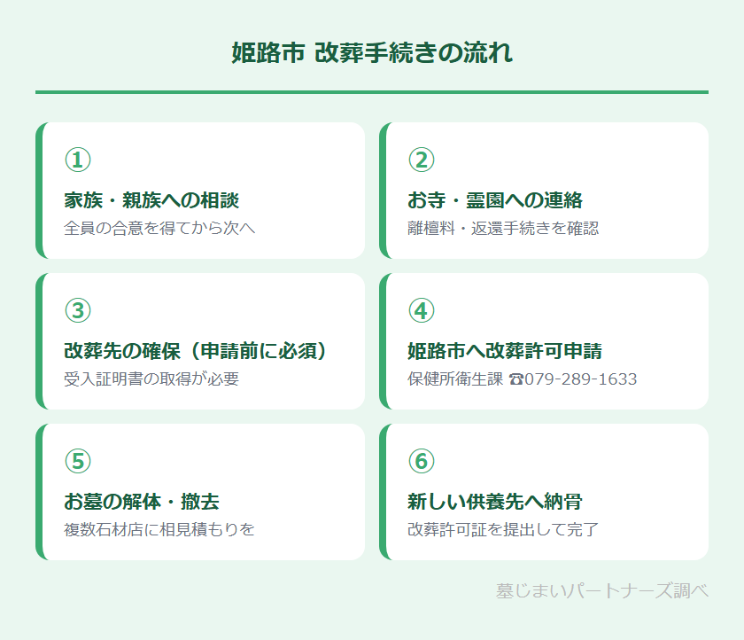 墓じまいは「①家族への相談→②お寺・霊園への連絡→③改葬先の確保→④行政手続き→⑤お墓の解体→⑥納骨」という順番で進めます。姫路市は古いお寺が多く、檀家関係が深い地域でもあります。各ステップのポイントを確認しておきましょう。