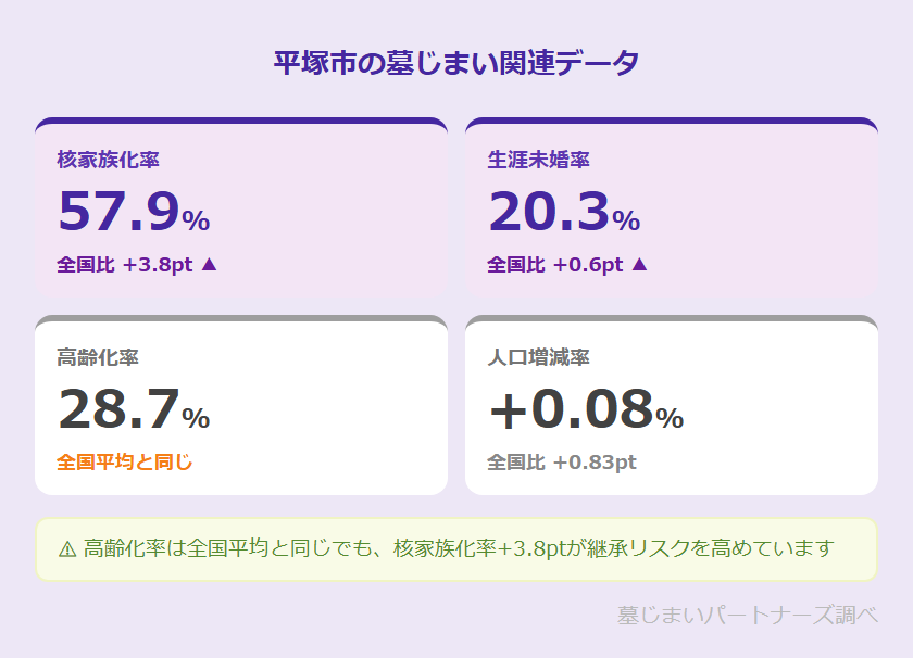 平塚市は神奈川県中部に位置する相模川河口の工業・商業都市です。高齢化率28.7%は全国平均(28.7%)と一致していますが、核家族化率57.9%(全国54.1%より+3.8pt)・生涯未婚率20.3%(全国19.7%より+0.6pt)が示すとおり、お墓の継承問題は静かに進行しています。