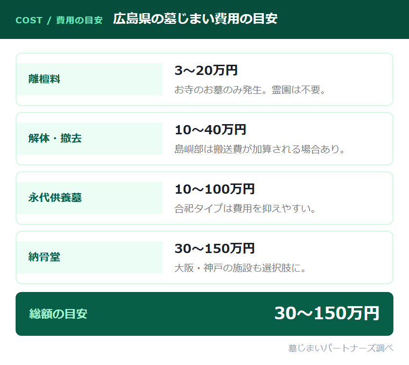 - 永代供養墓:10〜100万円程度。合祀か個別かで費用差が大きく、広島市・福山市の施設から大阪・神戸・東京の施設まで選択肢があります。