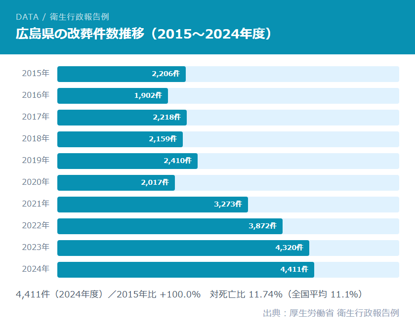 広島県の改葬件数は2015年度の2,206件から2024年度の4,411件へと、この10年で約100%増加しました。対死亡比11.74%(2024年)は全国平均(11.1%)を0.6ポイント上回っており、2021年以降に急加速しています。特に2021年の3,273件(前年比62%増)は大きな転換点となっており、コロナ禍以降に墓じまいへの意識が高まったことが影響していると考えられます。