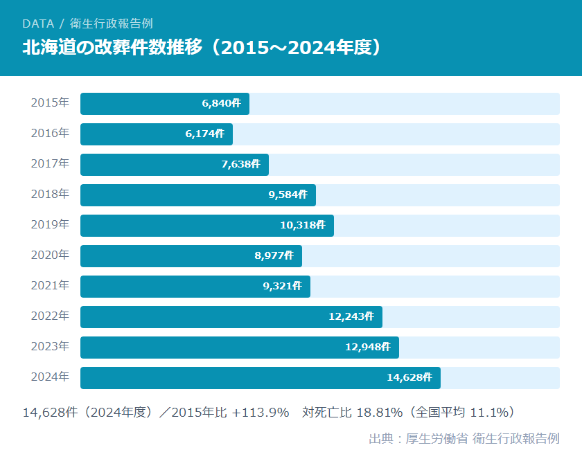 実際、北海道での改葬(遺骨を別の場所に移すこと)件数は2015年の6,840件から2024年には14,628件へと約2倍以上に増加しており、墓じまいへの関心の高まりが数字にも表れています。