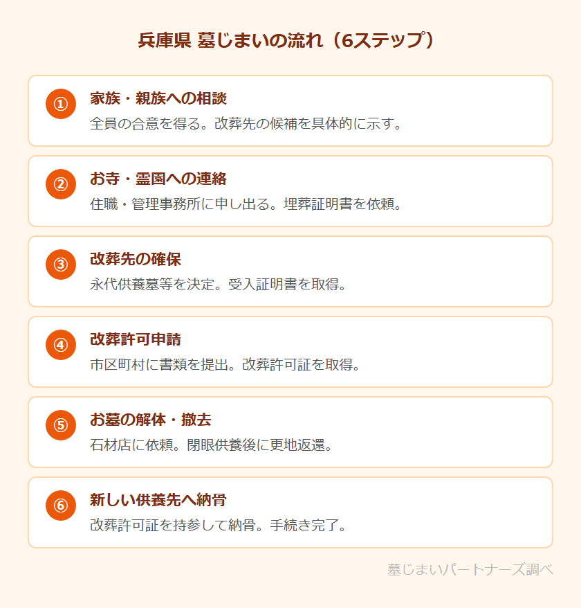 墓じまいは、家族・お寺・役所・石材店・改葬先の複数の関係者との調整が必要な手続きです。全体の流れを把握してから進めることで、スムーズに手続きが進みます。兵庫県での一般的な流れを6つのステップで確認しましょう。詳しい手続き全体については墓じまいの流れを8ステップで解説もご参照ください。